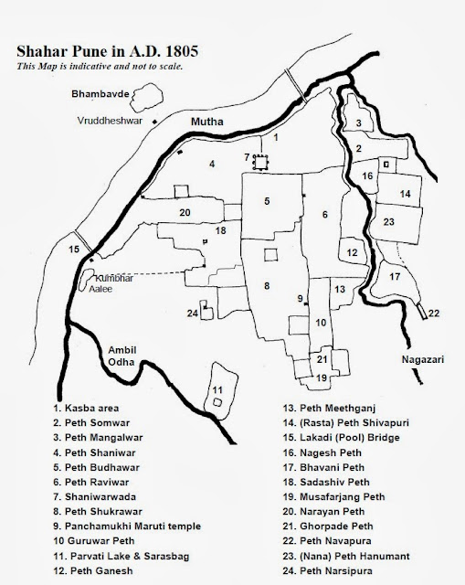 For a modern reader, Pune is a large bustling metropolis. However, the Pune we are looking at was a rather small city consisting of the 18 wards (Peths). Essentially, Pune has been built on the right bank of Mutha river, which follows a southwest- north east, turning to east course as it flows into the confluence with Mula river. The Pune city that we are looking at is confined to this right bank stretching from what is Lakdi Pul of today upto Sangam.